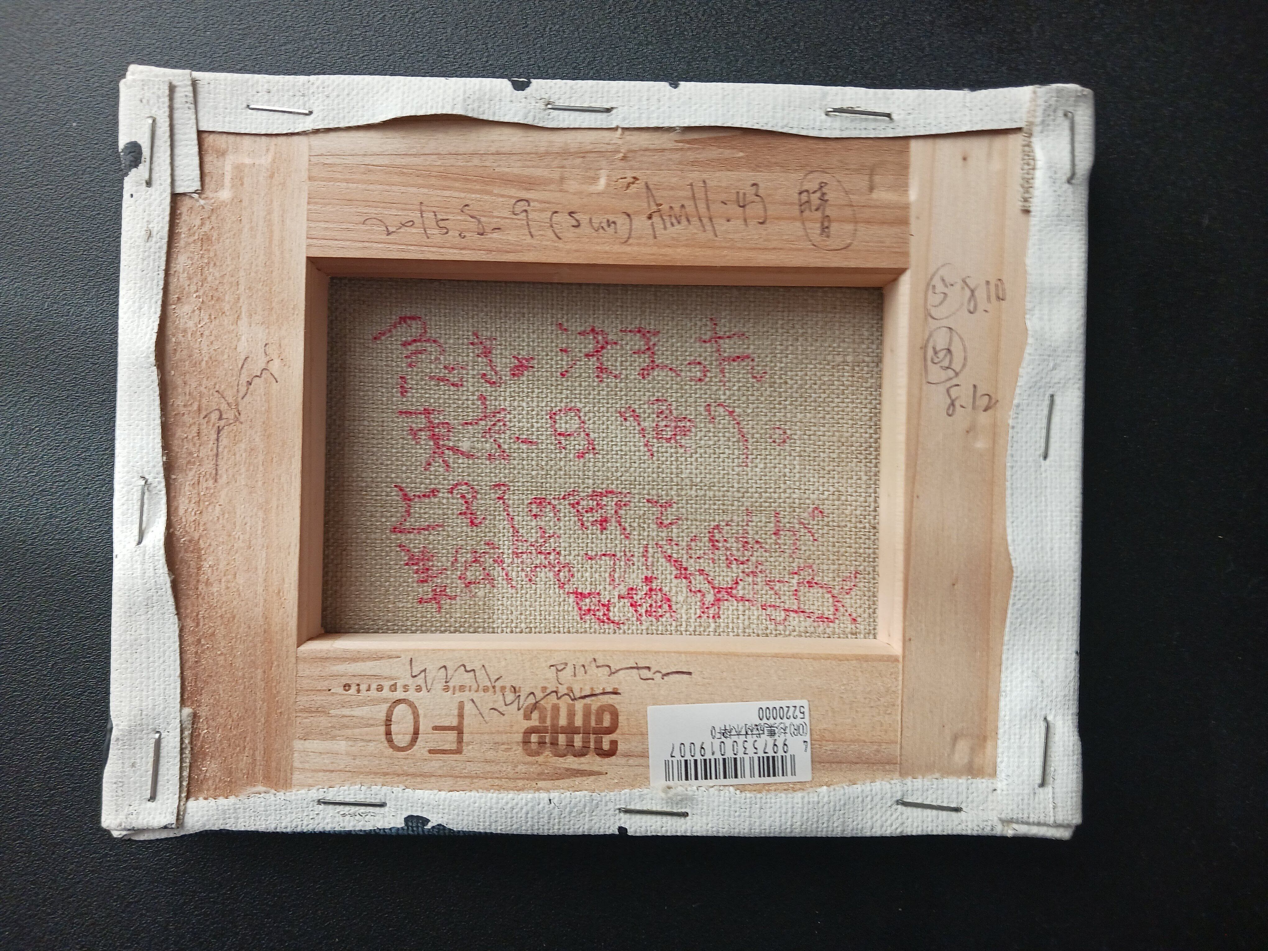 裏面には、その日の日記と制作日と使用絵具が書いていますが、一部書き忘れもあります。画鋲が付いた作品もありますが、針は抜いています。
